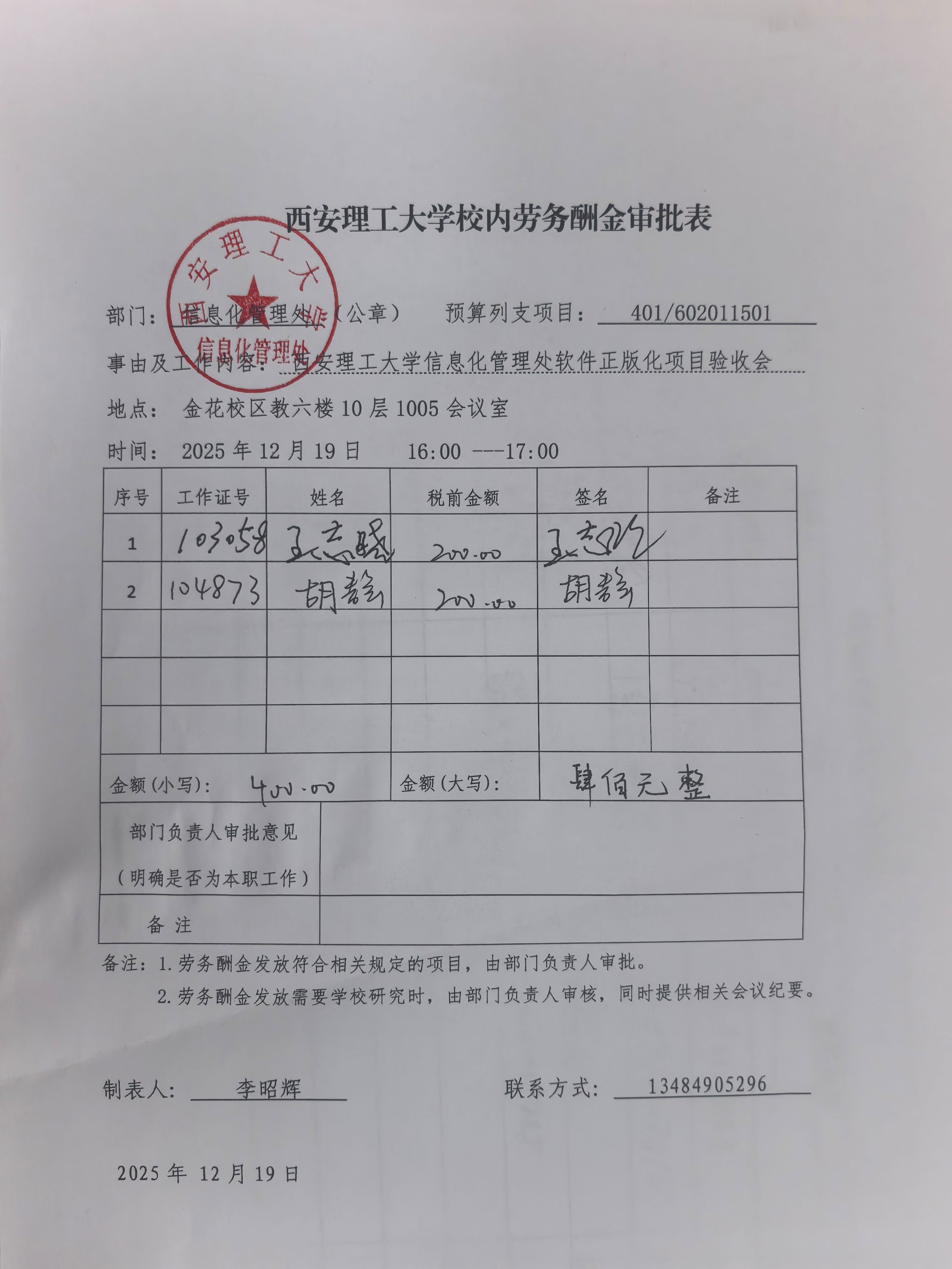 2025年12月19日下午16:00-17:00,在金花校区教六楼10层1005会议室,召开“西安理工大学信息化管理处软件正版化项目验收会”,相关单位工作人员及校内外专家参加会议。参会的校内专家应支付劳务费,明细见下表,特此公示: