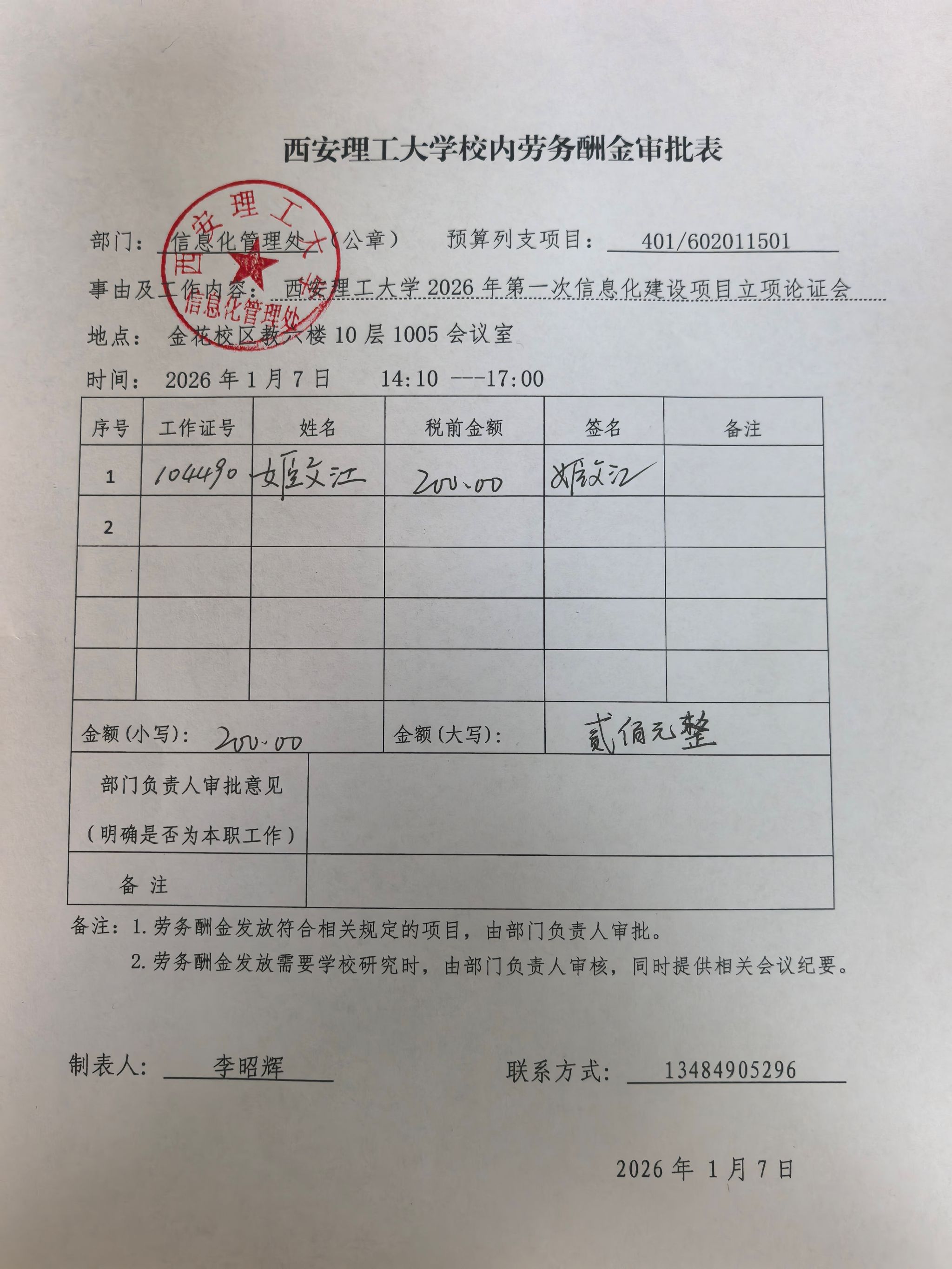 2026年1月7日下午14:10-17:00,在金花校区教六楼10层1005会议室,召开“西安理工大学2026年第一次信息化建设项目立项论证会”,相关单位工作人员及校内外专家参加会议。参会的校内专家应支付劳务费,明细见下表,特此公示: