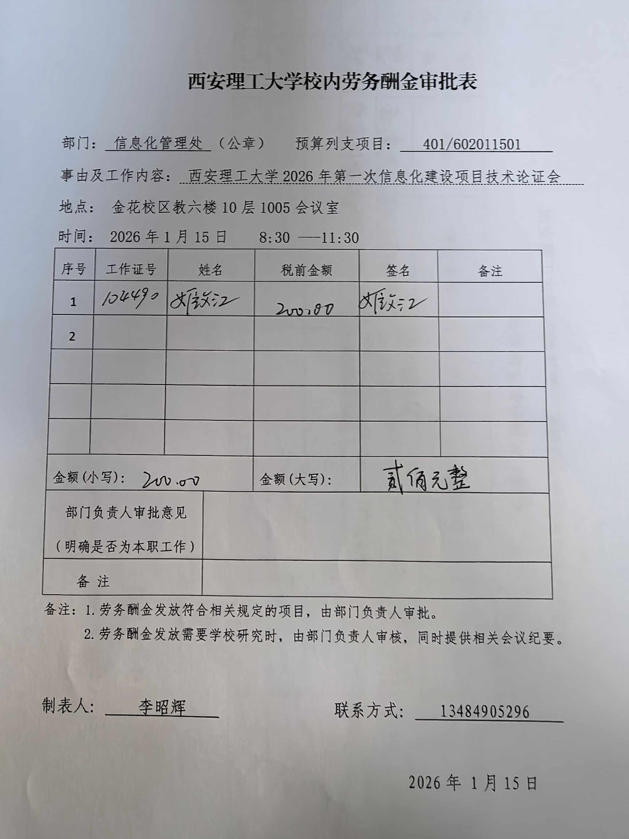 2026年1月15日上午8:30-12:30,在金花校区教六楼10层1005会议室,召开“西安理工大学2026年第一次信息化建设项目技术论证会”,相关单位工作人员及校内外专家参加会议。参会的校内专家应支付劳务费,明细见下表,特此公示: