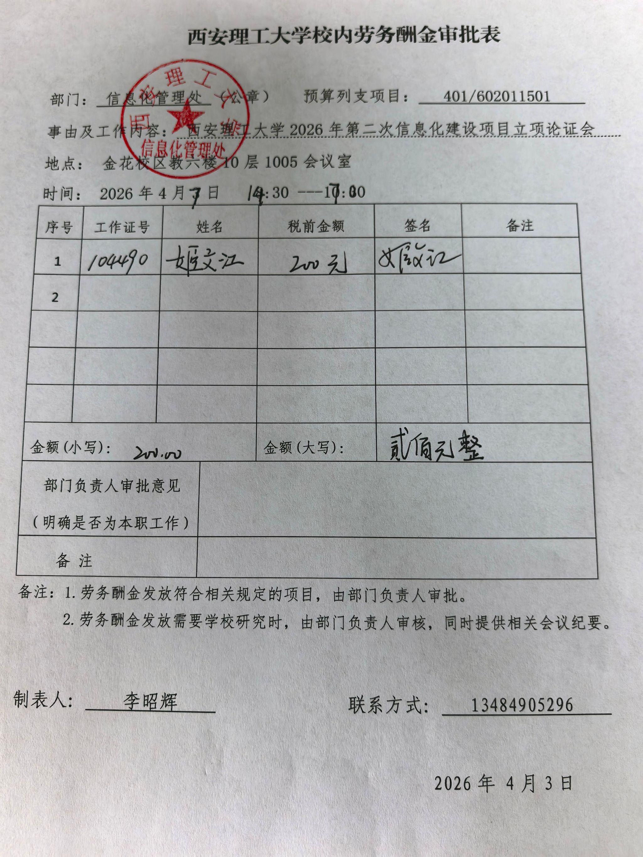 2026年4月7日下午14:30-17:00,在金花校区教六楼10层1005会议室,召开“西安理工大学2026年第二次信息化建设项目立项论证会”,相关单位工作人员及校内外专家参加会议。参会的校内专家应支付劳务费,明细见下表,特此公示: